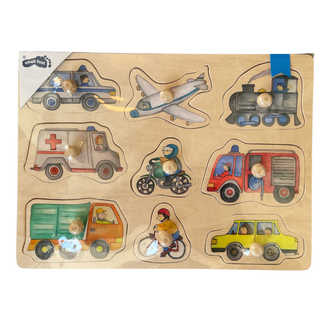 Mit diesem Setzpuzzle lernt ihr Kind verschiedene Fahrzeue kennen ! Dieses robuste Setzpuzzle aus Holz beinhaltet liebevoll illustrierte Fahrzeuge, wie zu Beispiel Fahrrad, Auto, Flugzeug, Krankenwagen mit Holzknopf. An dem kleinen runden Holzknopf lassen sich die Puzzleteile gut von Kleinkindern greifen und in die vorgestanzte Form setzen. So wird ganz spielerisch die Feinmotorik und Geduld gefördert. Wohin geht der nächste Ausflug? Vielleicht auf den Bauernhof oder die große Stadt? Durch Puzzlespiele im Allgemeinen wird die räumliche Vorstellungskraft gefördert, man lernt spielerisch das Verständnis für die Dinge im Leben und deren Zusammenhänge.