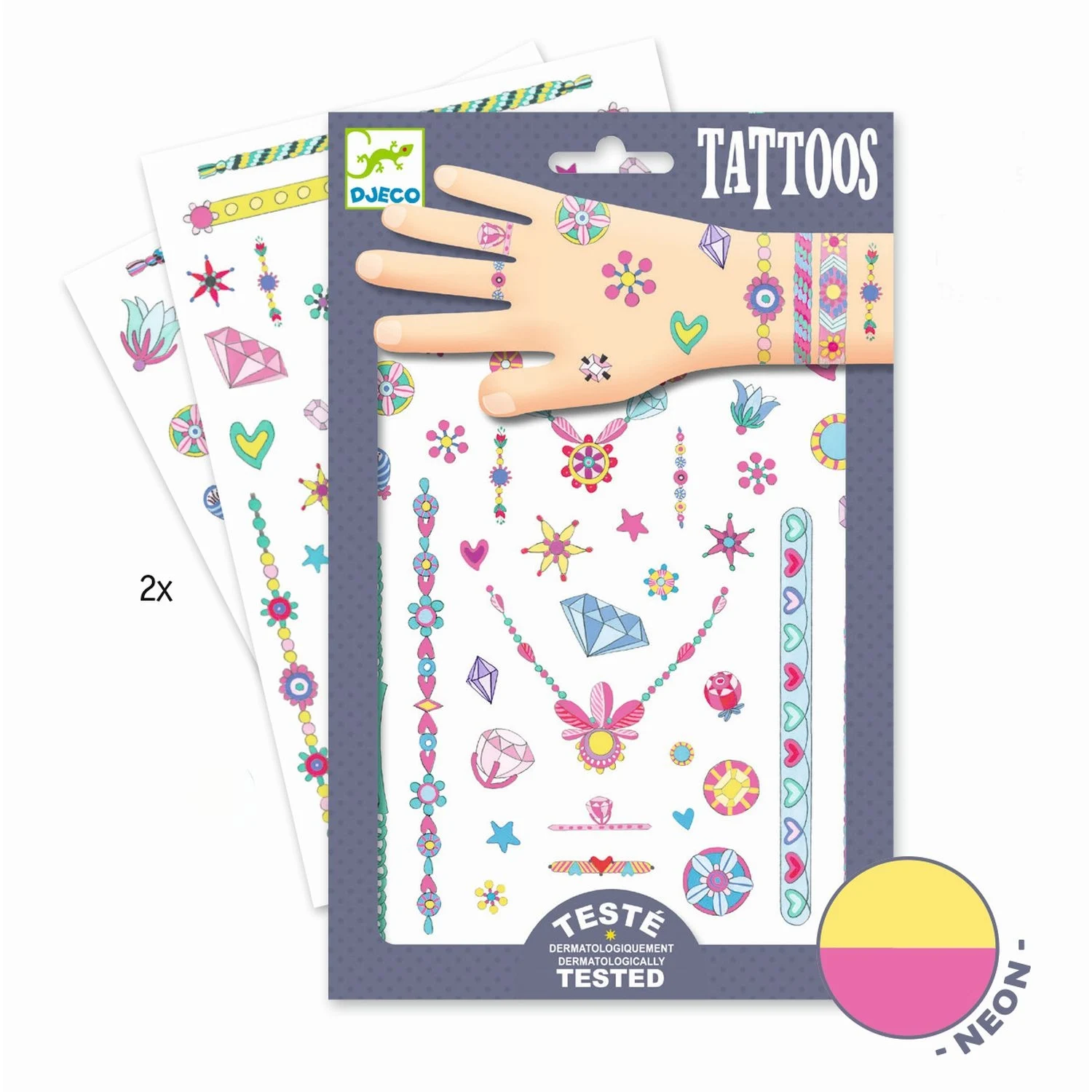 Zwei Bögen mit temporären Schmuck-Tattoos in Neonfarben. Armbänder, Ringe, Halsketten oder kleine Broschen, für jeden ist etwas dabei. Und zur größten Freude der Kinder sind sie mit rosa und gelben fluoreszierenden Details verziert! Die vorgeschnittenen Tattoos sind einfach anzuwenden und werden mit etwas Wasser aufgetragen. Dermatologisch getestet.