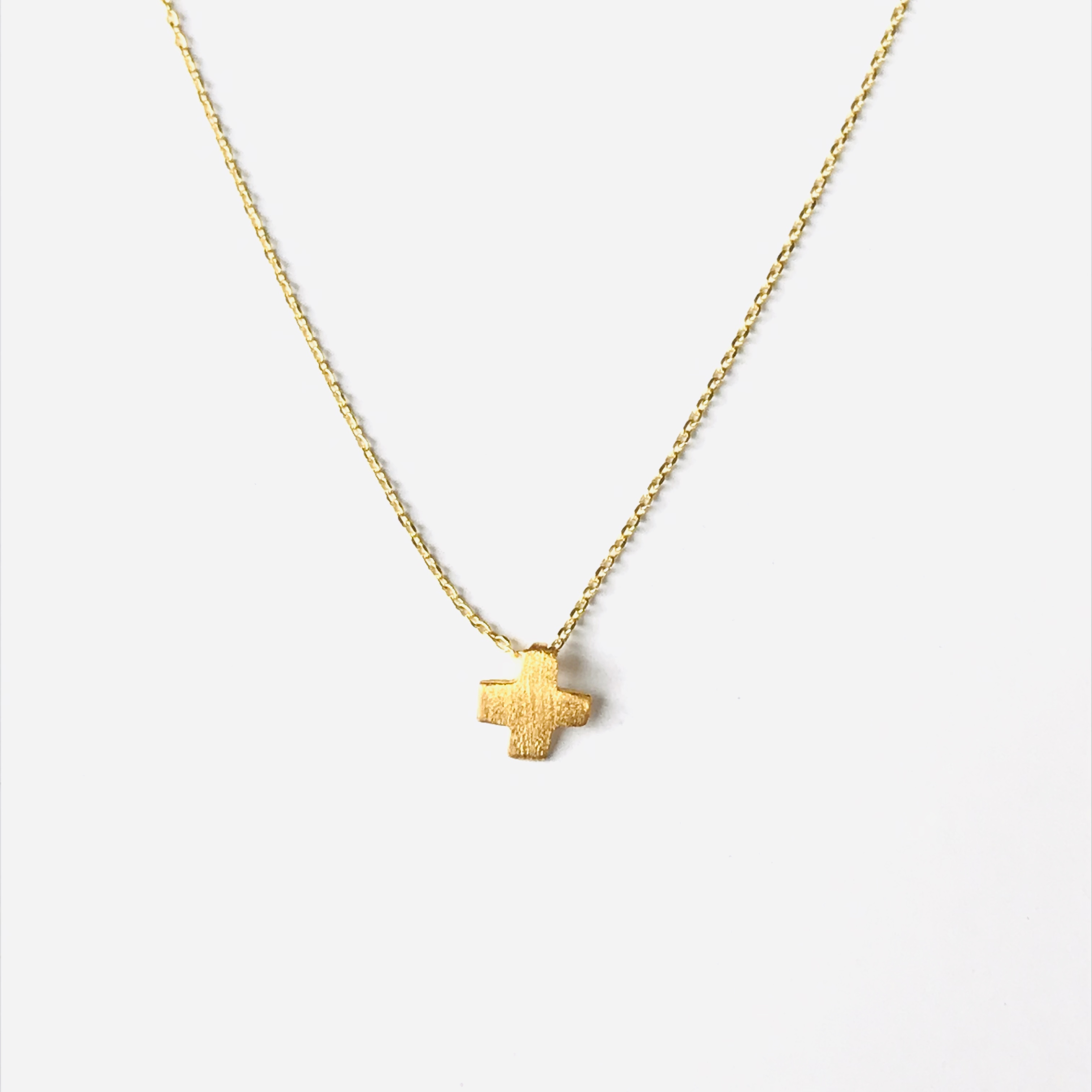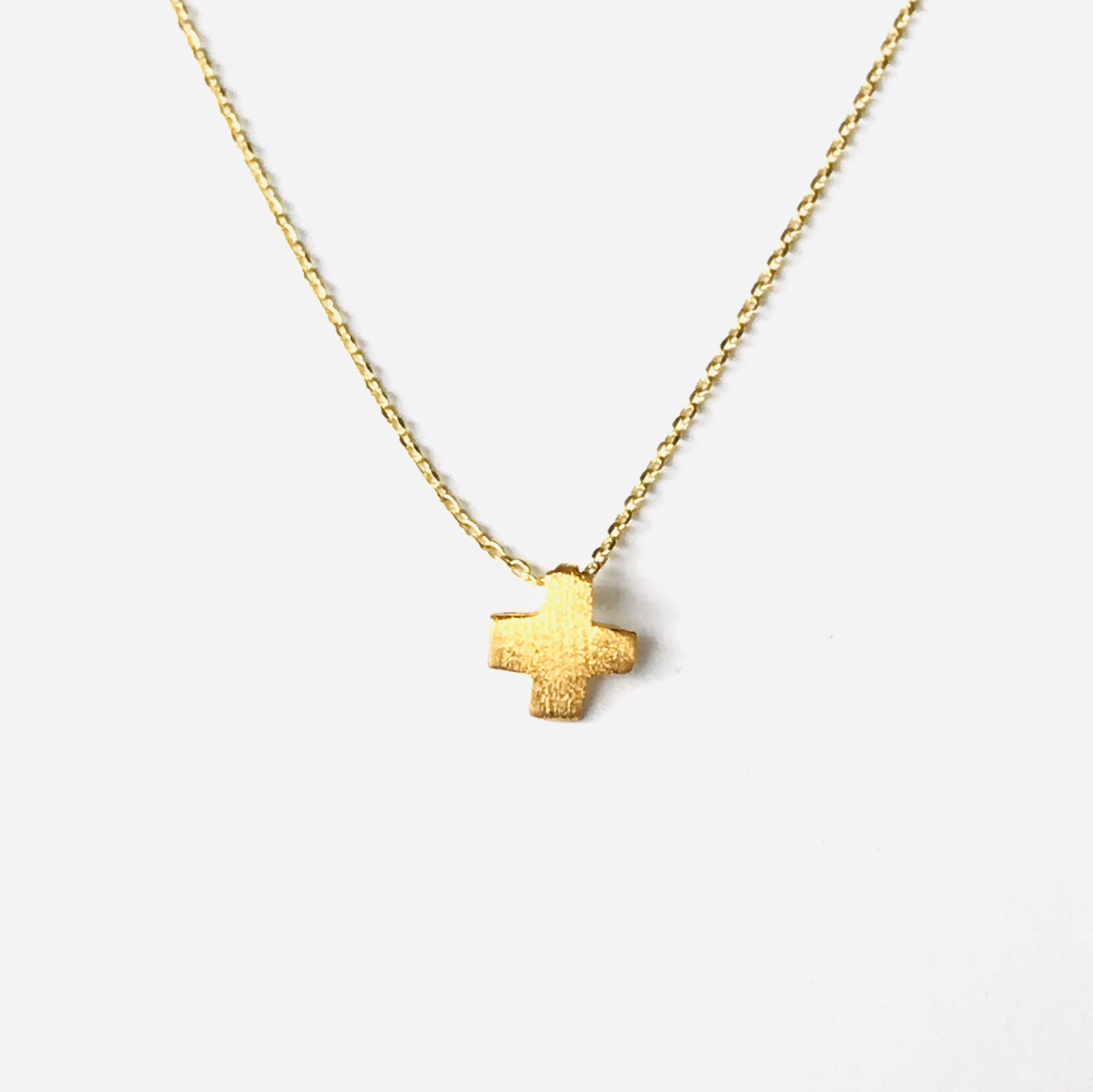 Die zarte Kette aus dem Hause Krinaki ist aus 585/000er Gelbgold von Hand gefertigt. Sie ist sehr filigran und professionell gearbeitet. Der Anhänger ist ein kleines Kreuz, ebenfalls aus 585/000er Gelbgold. Das Kreuz ist klein aber fein, 5,5 x 5,5 mm. Die Oberfläche ist in ganz einzigartiger Art und Weise mattiert. Das ergibt ein modernes Erscheinungsbild und ein ganz individuelles kleines Kreuz. Die Länge der zarten Ankerkette ist 45 cm, sie lässt sich aber auch etwas kürzer, 40 cm tragen, da hier eine Zwischenöse eingearbeitet ist.