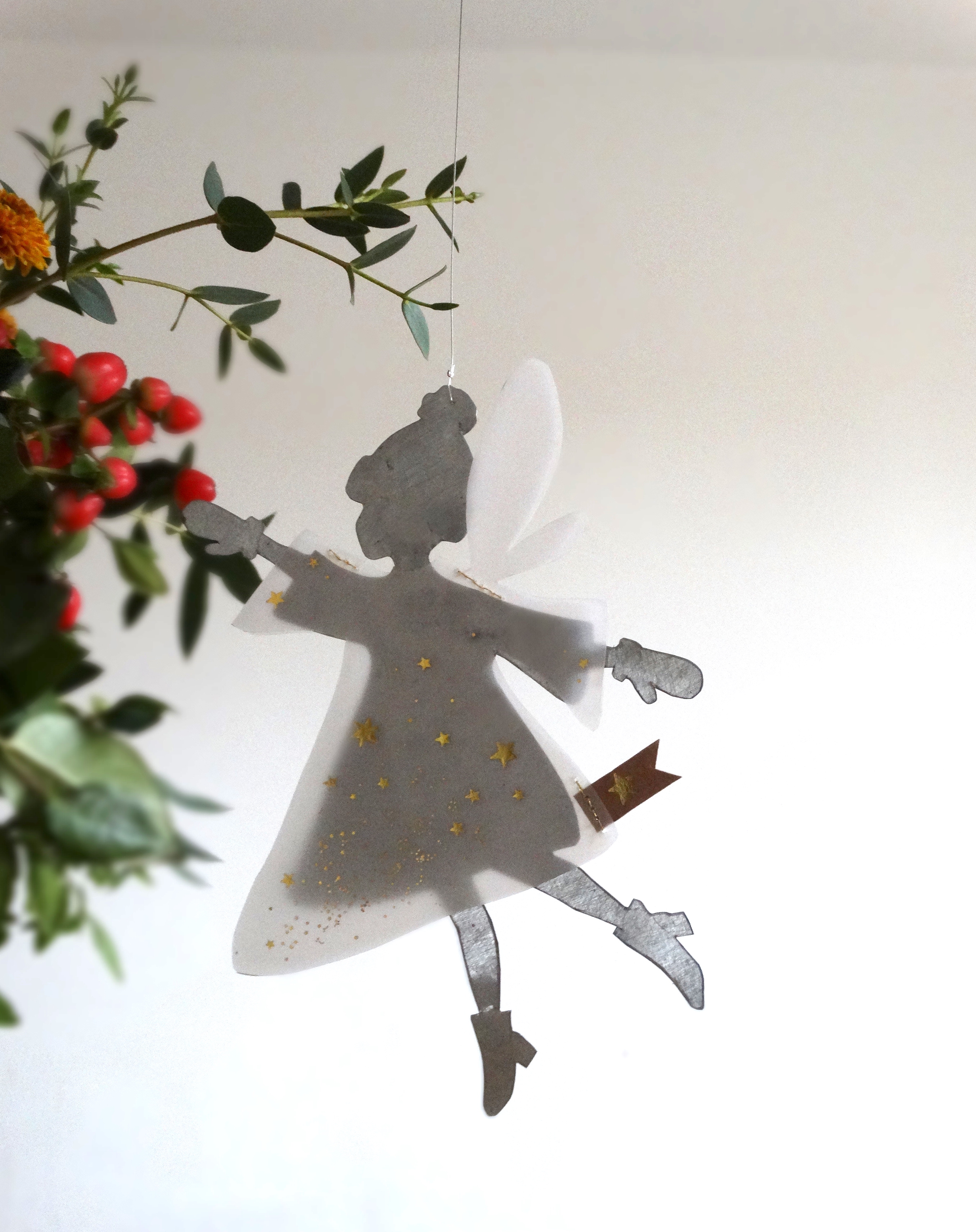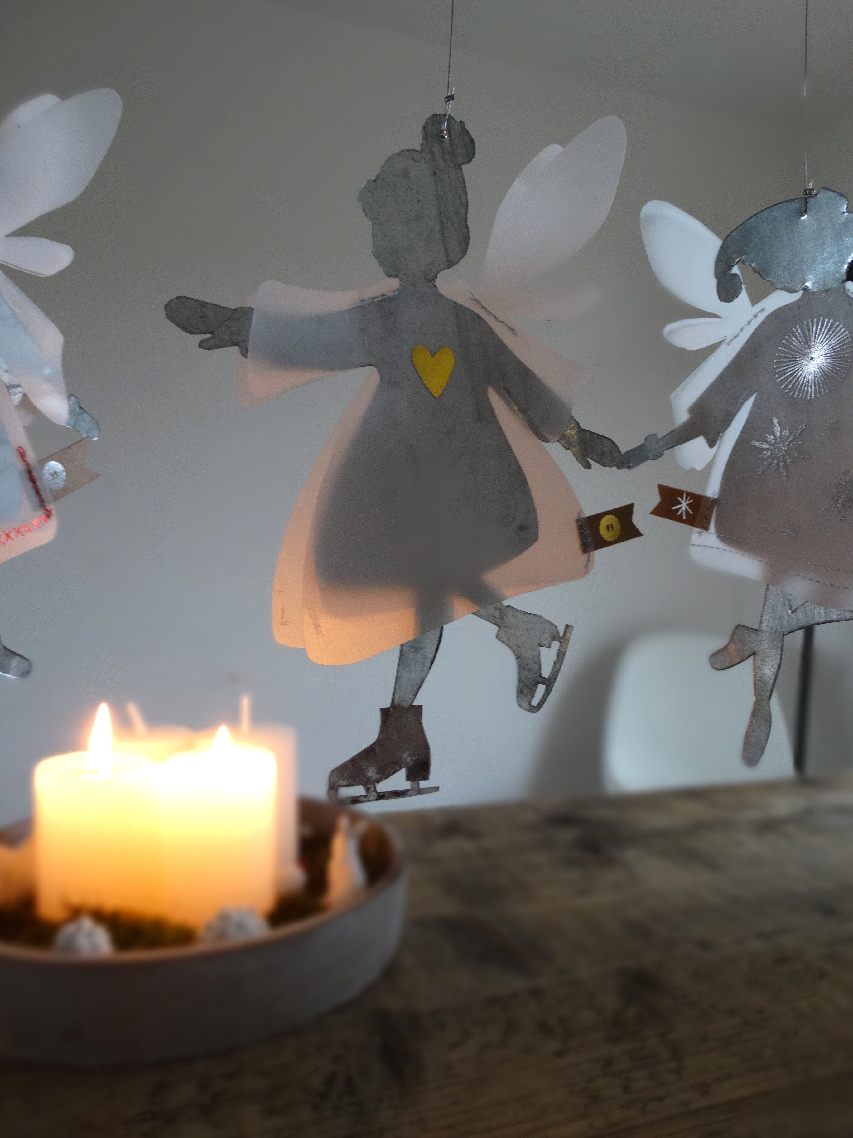 Winterfeen zur Dekoration in der Winter -oder zur Weihnachtszeit. Als Geschenkanhänger auch eine hübsche Idee. Die Winterfee ist aus Blech und Papier und ist zum Aufhängen. In einem winterlichen Gesteck macht sie sich auch ganz hervorragend.